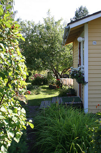 Puutarha-alueen hiekkatiet polveilevat mökkirivien lomassa. Niitä reunustavat orapihlaja-aidat. Portilla oleva asiattoman oleskelun kieltävä kyltti on tarkoitettu estämään lähinnä turhaa autoilua mökkiteillä.